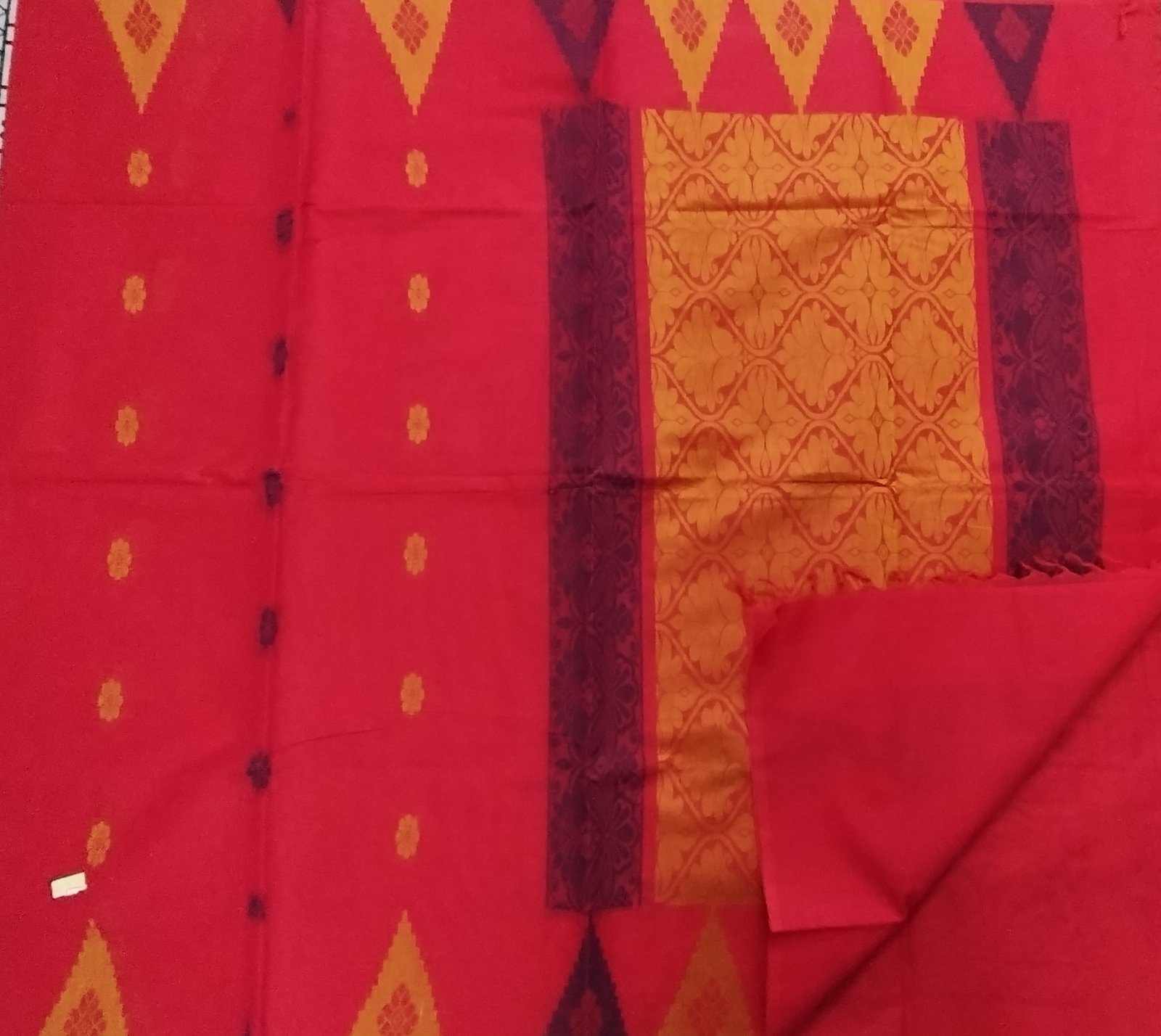 This Negamam pure cotton saree features a vibrant red body woven in soft, breathable cotton, offering comfort along with striking visual appeal. The body is adorned with small woven buttas and rhythmic temple-inspired geometric motifs arranged along the length, creating a lively yet balanced composition rooted in traditional aesthetics. The saree is complemented by a contrasting mustard pallu enriched with intricate woven patterns that add depth and texture. Deep maroon accents framing the pallu enhance the contrast, lending richness and definition to the overall drape. The harmonious blend of red, mustard, and maroon makes this saree a beautiful choice for festive mornings, cultural gatherings, and elegant everyday wear.