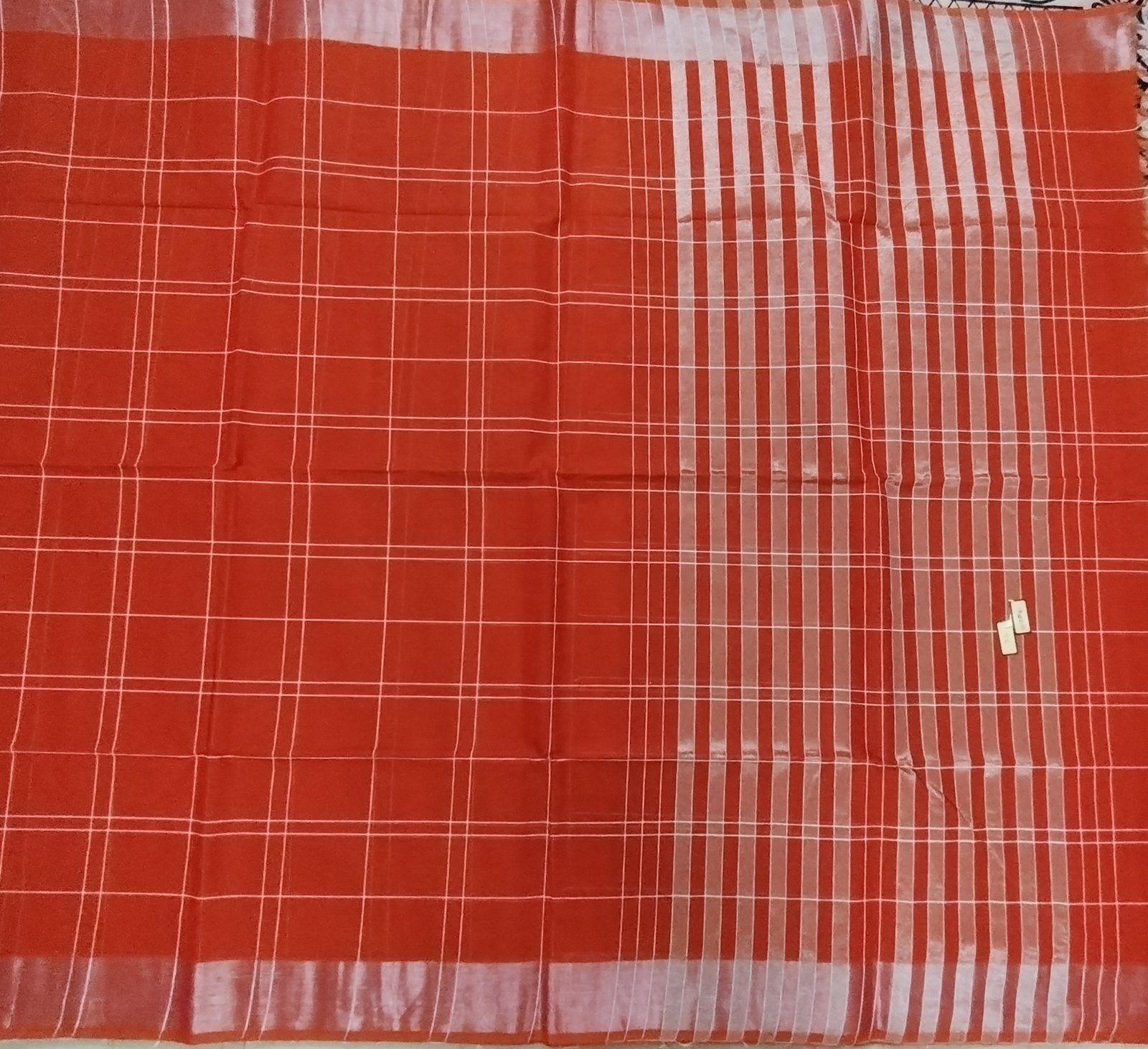 This Negamam pure cotton saree features a rich rust red body woven in breathable cotton, offering comfort and ease for everyday and extended wear. The body is detailed with fine white checks arranged in a balanced grid, lending the saree a clean, structured look with timeless appeal.