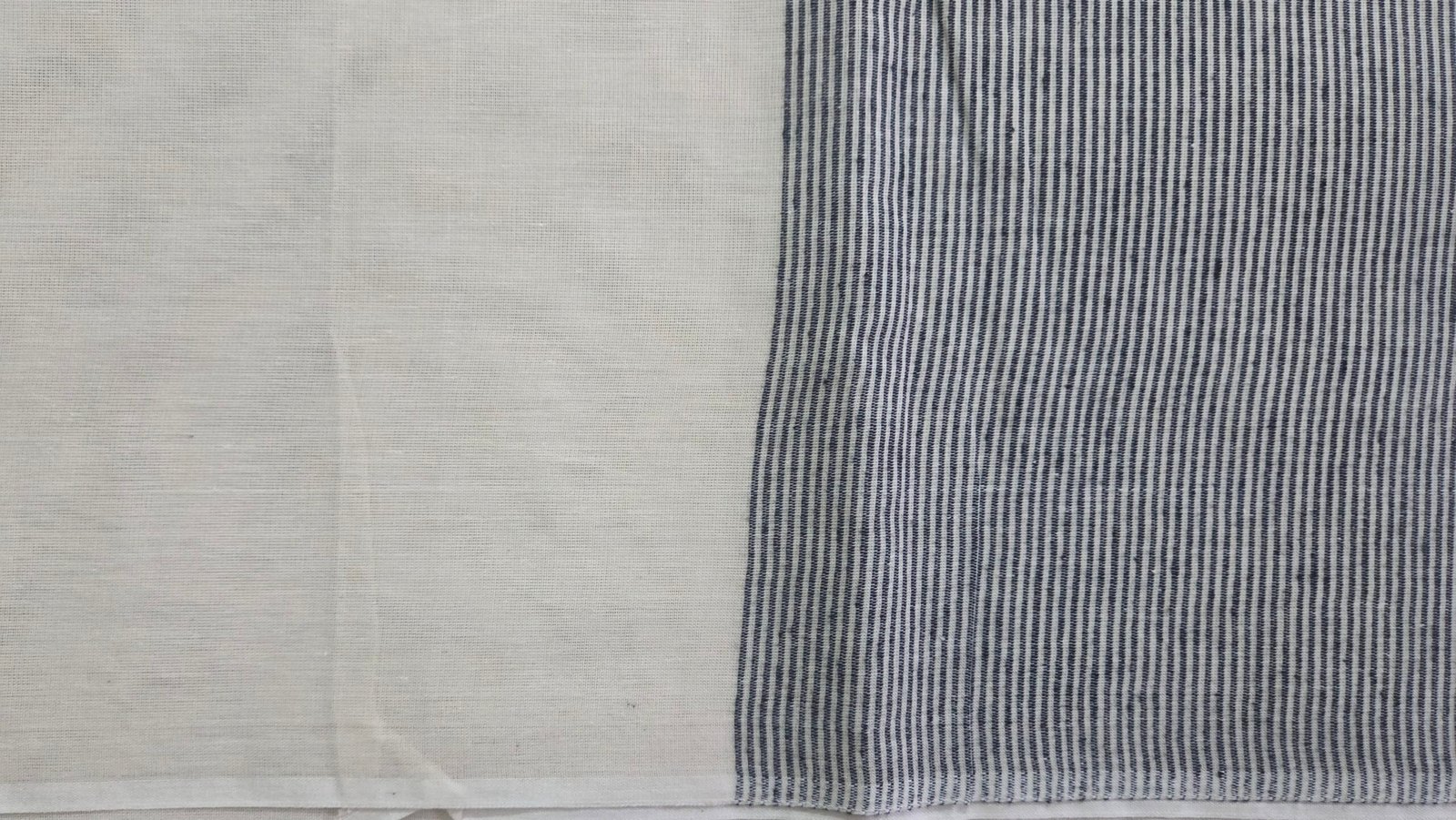 This Negamam pure cotton saree features a serene ivory white body, woven in soft, breathable cotton that offers effortless comfort and a graceful drape for everyday and extended wear. The minimal solid body highlights the natural texture of cotton, lending a calm and understated elegance. The saree is paired with a contrasting charcoal grey pallu, detailed with fine vertical pinstripes that add subtle rhythm and structure. A slender striped accent panel further enhances the composition, reflecting the quiet sophistication and heritage simplicity of traditional Negamam weaving.