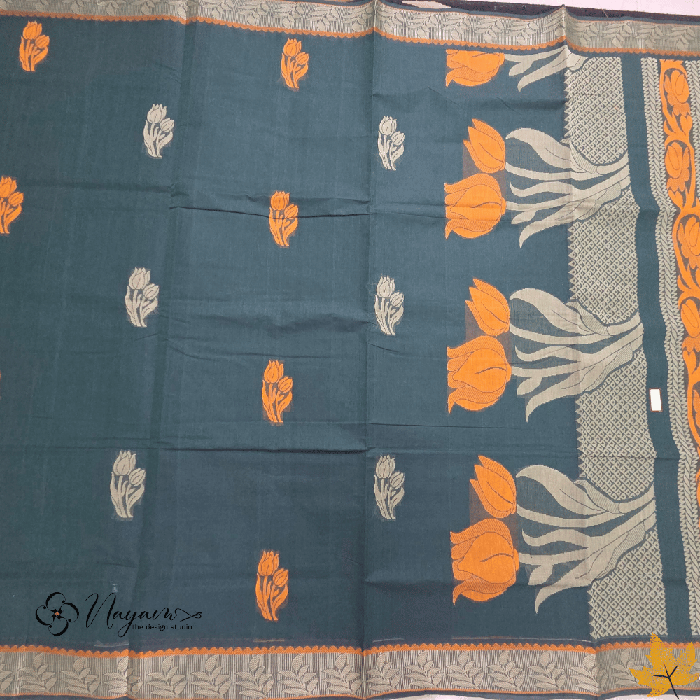 This Negamam pure cotton saree features a deep teal green body, beautifully accented with understated floral buttas woven across the length of the saree. The placement of the motifs brings a gentle rhythm to the fabric, maintaining a balanced and uncluttered aesthetic. The highlight of the saree is its thoughtfully designed pallu, adorned with bold floral forms and intricate woven detailing that add character without overpowering the body. A coordinated border frames the saree gracefully, lending structure and a subtle traditional finish.