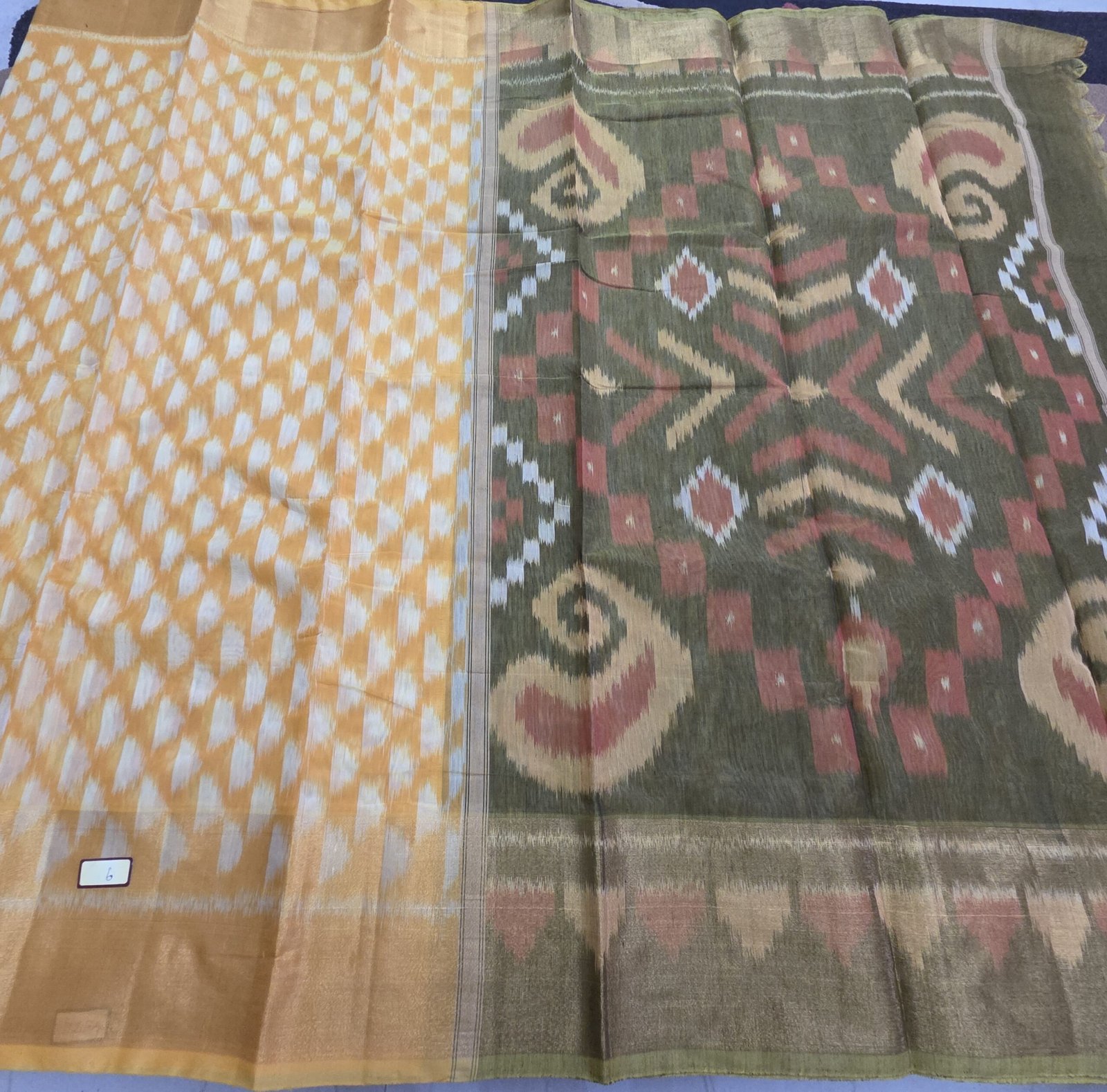 The saree is beautifully contrasted with a deep olive green Pochampalli pallu, woven with bold geometric and chevron motifs in earthy hues of maroon, beige, and off-white. These distinctive patterns lend depth and a strong visual identity to the saree, while the subtle woven borders provide a cohesive transition between the body and pallu.