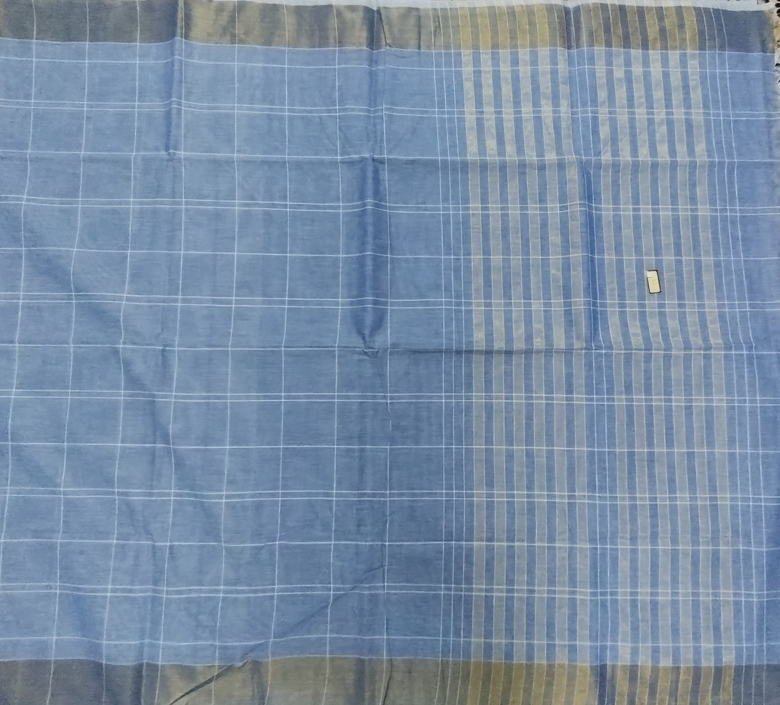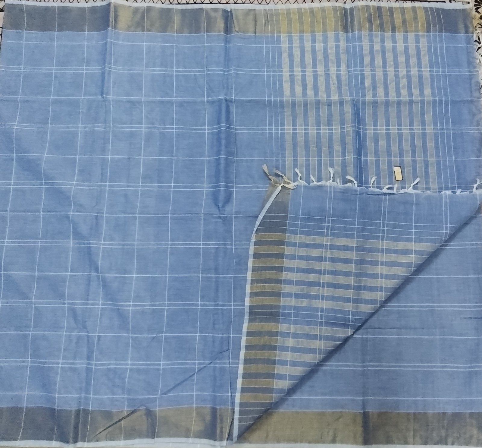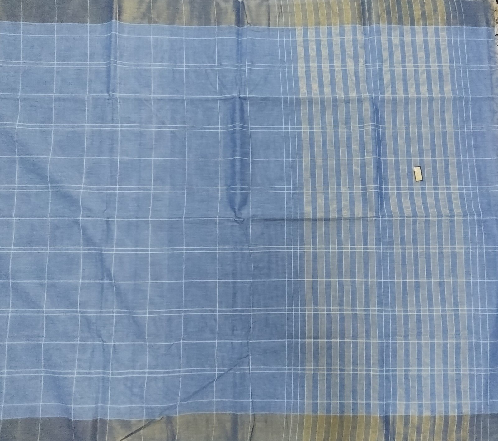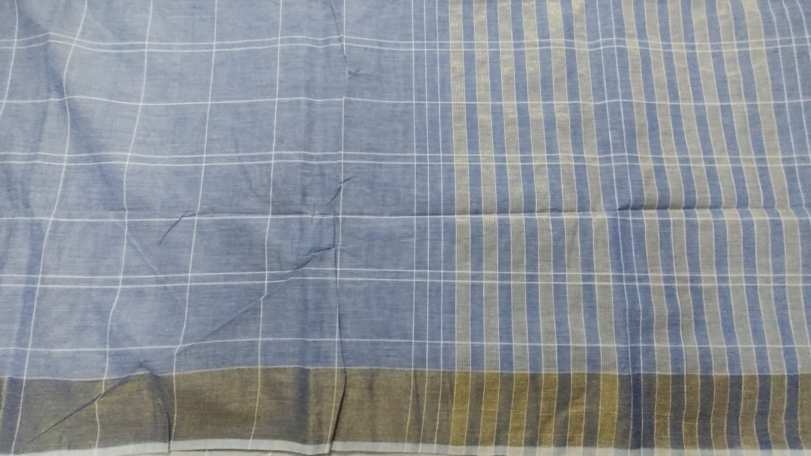 This cotton saree features a soothing sea-blue body woven with fine white checks that create a subtle, airy rhythm across the fabric. The double-shaded weave brings out gentle tonal shifts, allowing the colour to appear lighter or deeper with movement and light. The pallu is accentuated with vertical white stripes, adding quiet contrast and a touch of understated elegance without overpowering the body. A soft, coordinated border frames the saree, maintaining balance and continuity in the overall design. Woven in pure cotton, the saree is breathable, lightweight, and comfortable for all-day wear, making it ideal for everyday elegance, workwear or relaxed festive occasions.