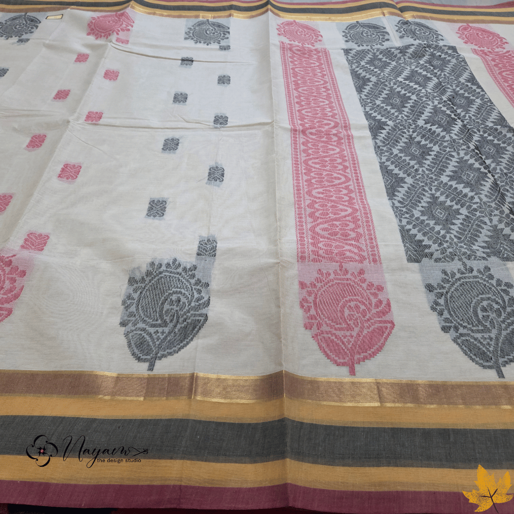 These Negamam pure cotton saree features a soft pastel shade that serves as a calm canvas for its striking woven details. The centre panel is adorned with intricate geometric jaal patterns in deep charcoal, lending depth and visual rhythm to the weave. Broad borders frame the saree gracefully, and introduces a warm contrast, adding character without overpowering the palette. Traditional leaf motifs woven along the length echo the region’s weaving heritage and lend an artisanal charm to the drape. Woven in pure cotton, this saree offers a breathable, lightweight texture with a fluid fall—ideal for long wear in all climates.