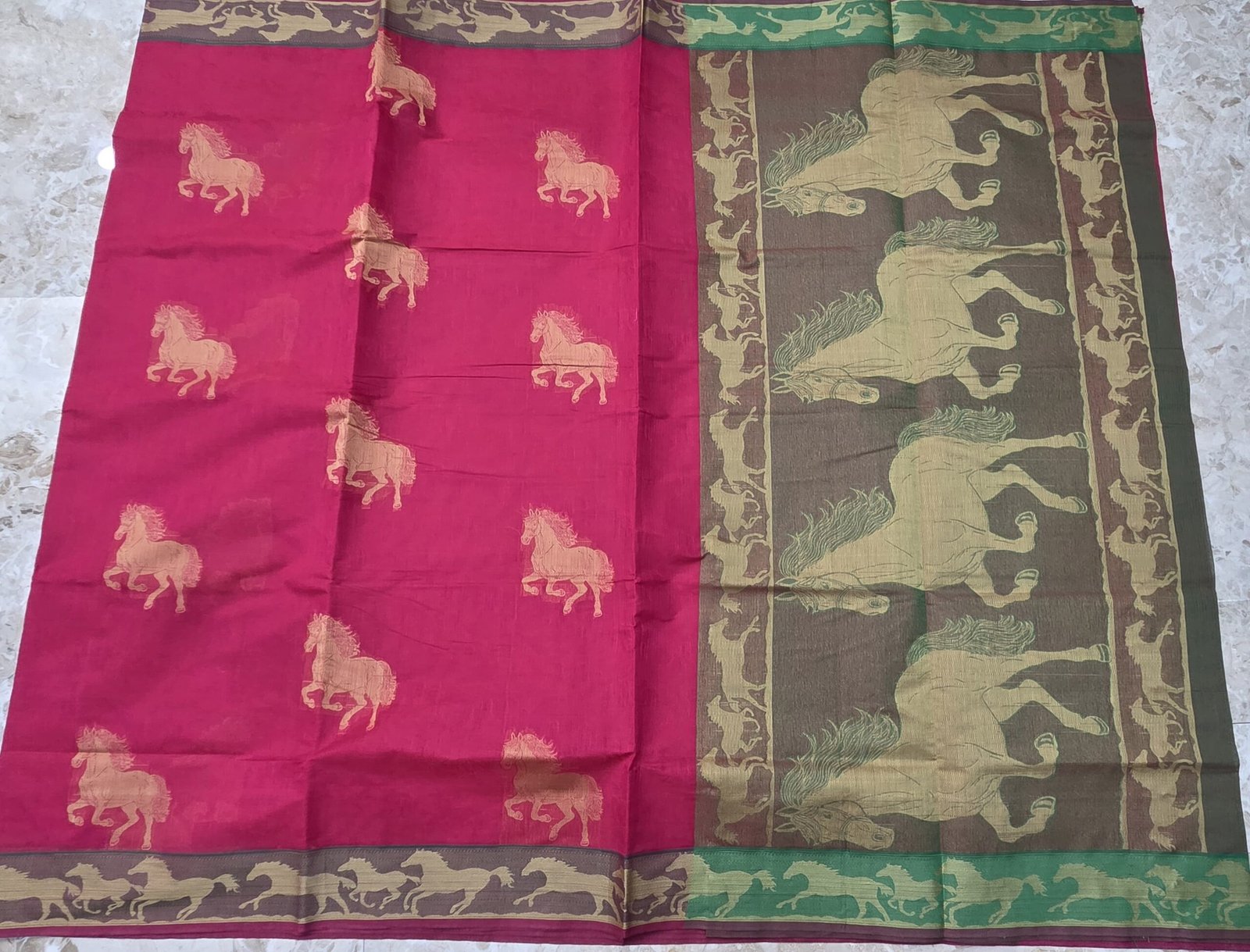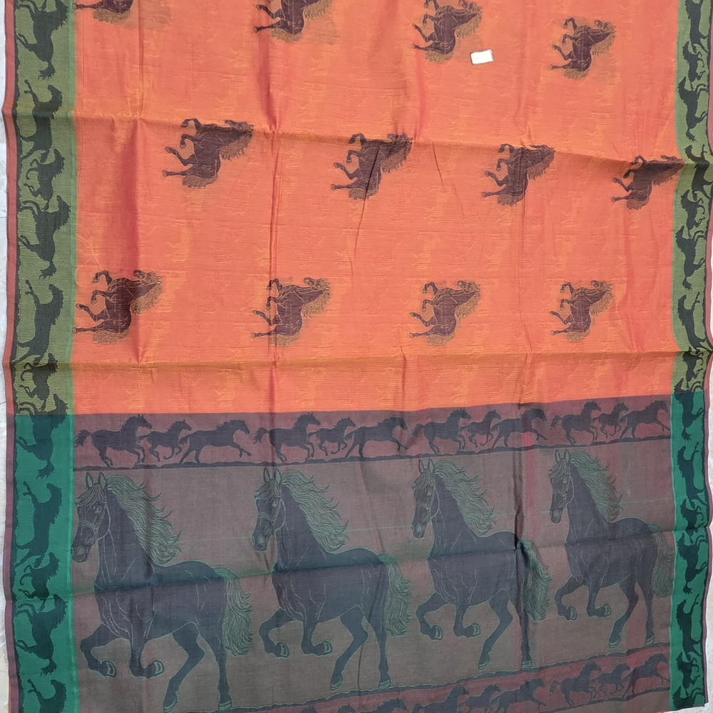 This woven negamam cotton saree features a rich orange body adorned with repeating horse motifs, symbolising strength and movement. The motifs are woven in a subtle contrasting tone, lending character without overpowering the base colour. The saree is paired with a striking olive green pallu, detailed with bold, running horse figures framed by traditional borders. The contrast pallu adds narrative depth and visual drama, making the saree stand out when draped. Finished with complementary borders that echo the pallu motifs, this saree balances folk-inspired design with everyday elegance. Crafted in pure cotton, it offers a comfortable drape, breathable texture, and understated sheen—ideal for long wear.