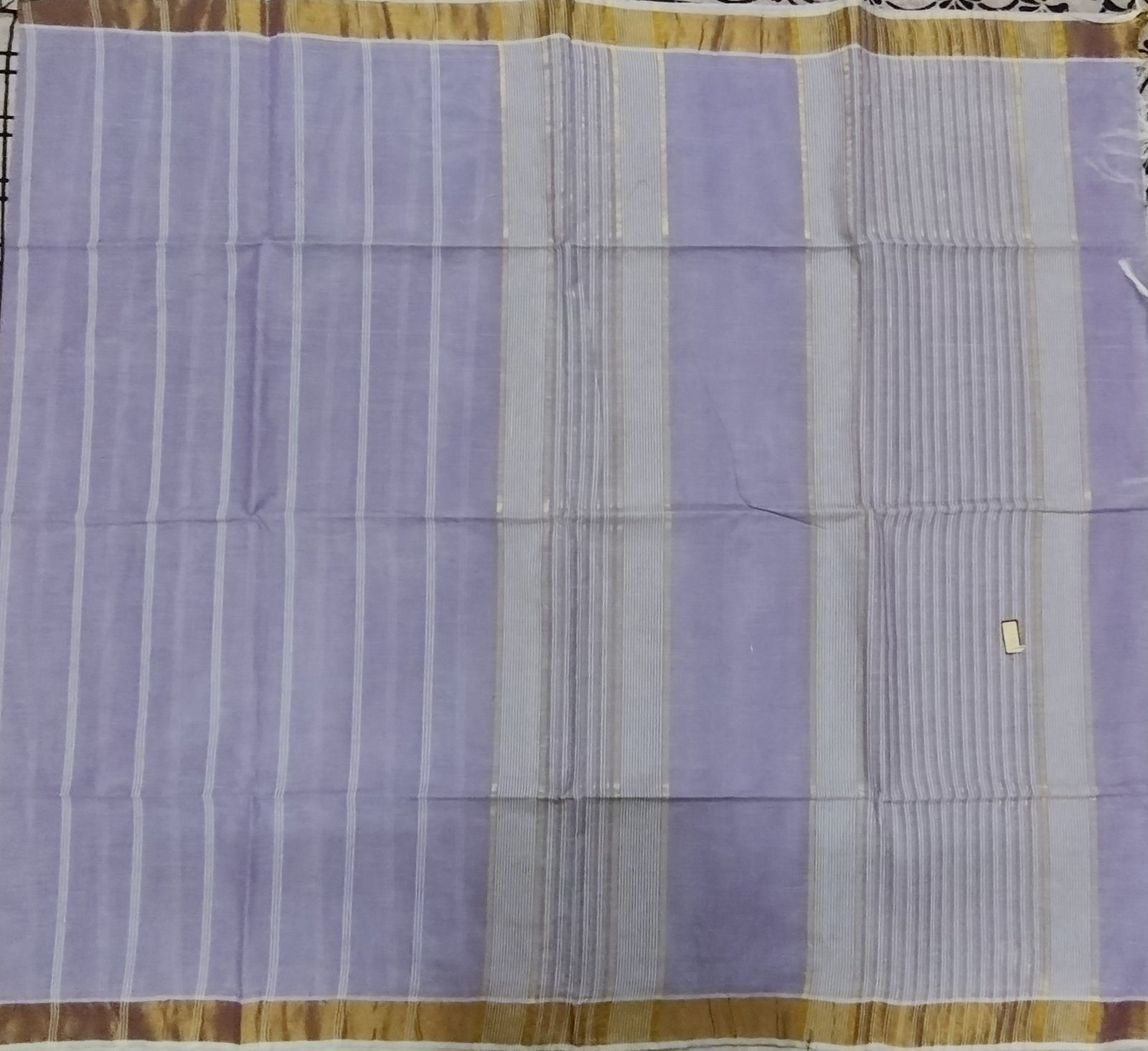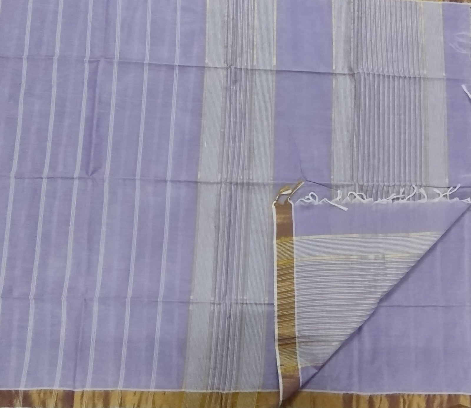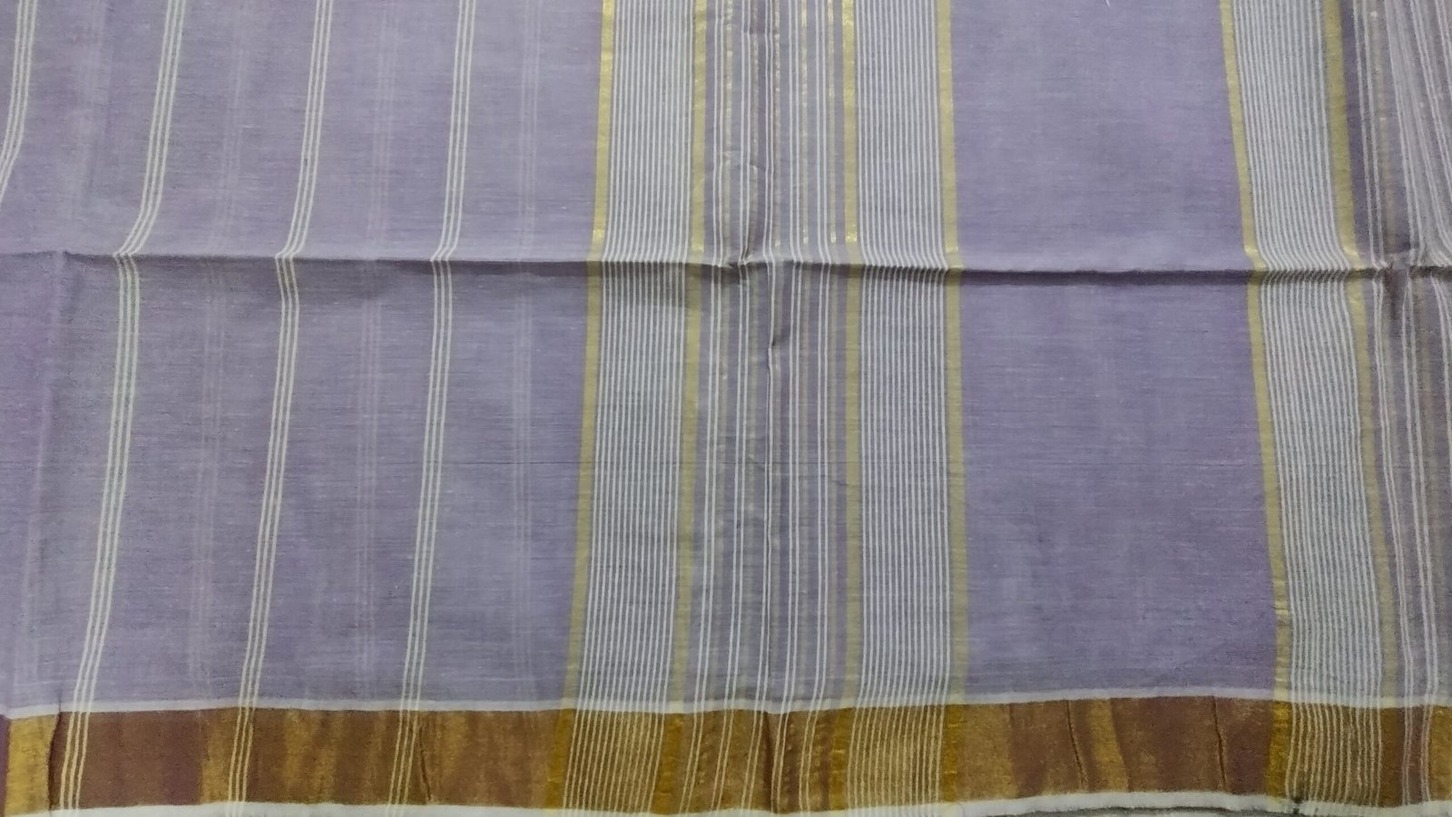 This Negamam pure cotton saree features a soft lavender grey body, woven in breathable cotton that offers all-day comfort with a refined, understated charm. The body is detailed with fine vertical stripe patterns that lend gentle texture and a sense of movement while keeping the overall look minimal and elegant. The saree is highlighted by a subtle antique gold border that adds warmth and contrast to the cool-toned body. The pallu continues with delicate linear weaves in coordinated hues, reflecting the simplicity and grace characteristic of traditional Negamam craftsmanship.