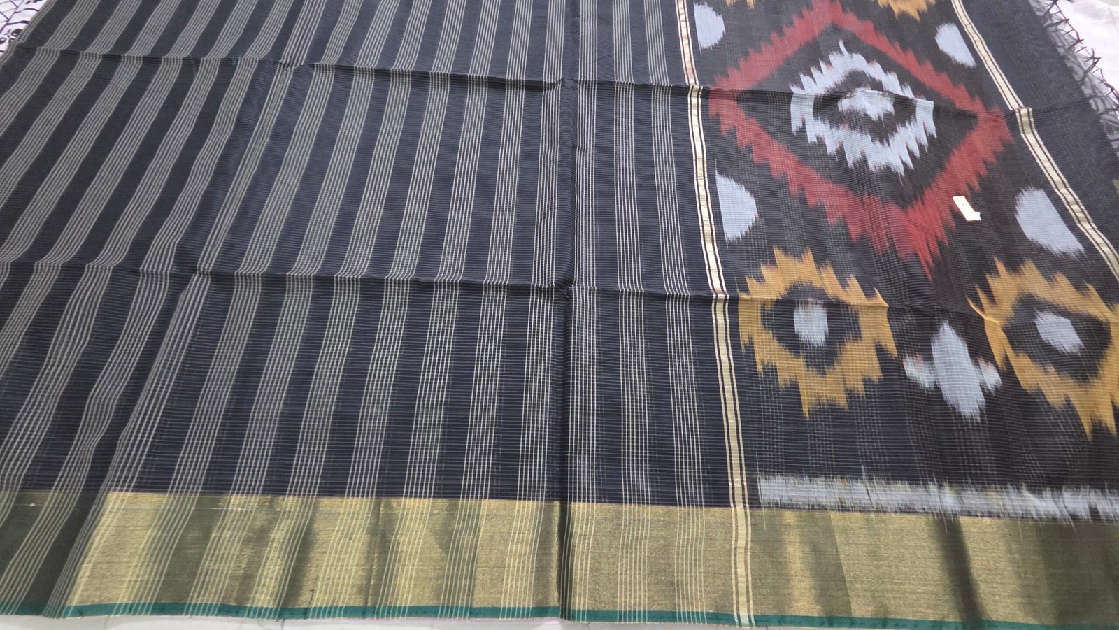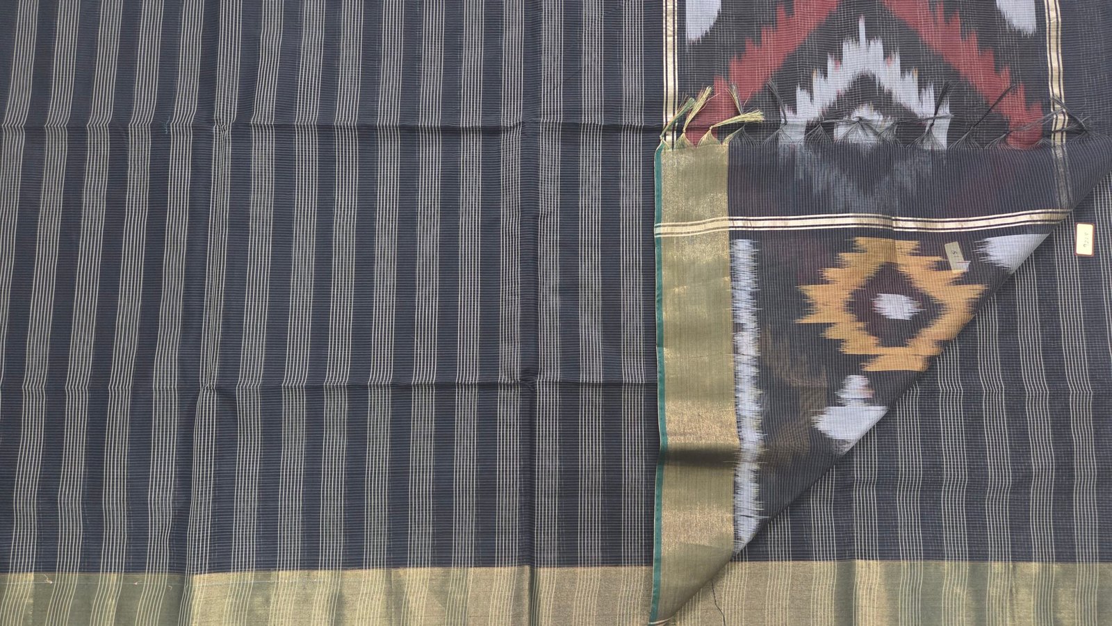 Deep Green Cotton Saree with White Pinstripes and Ikat Pallu