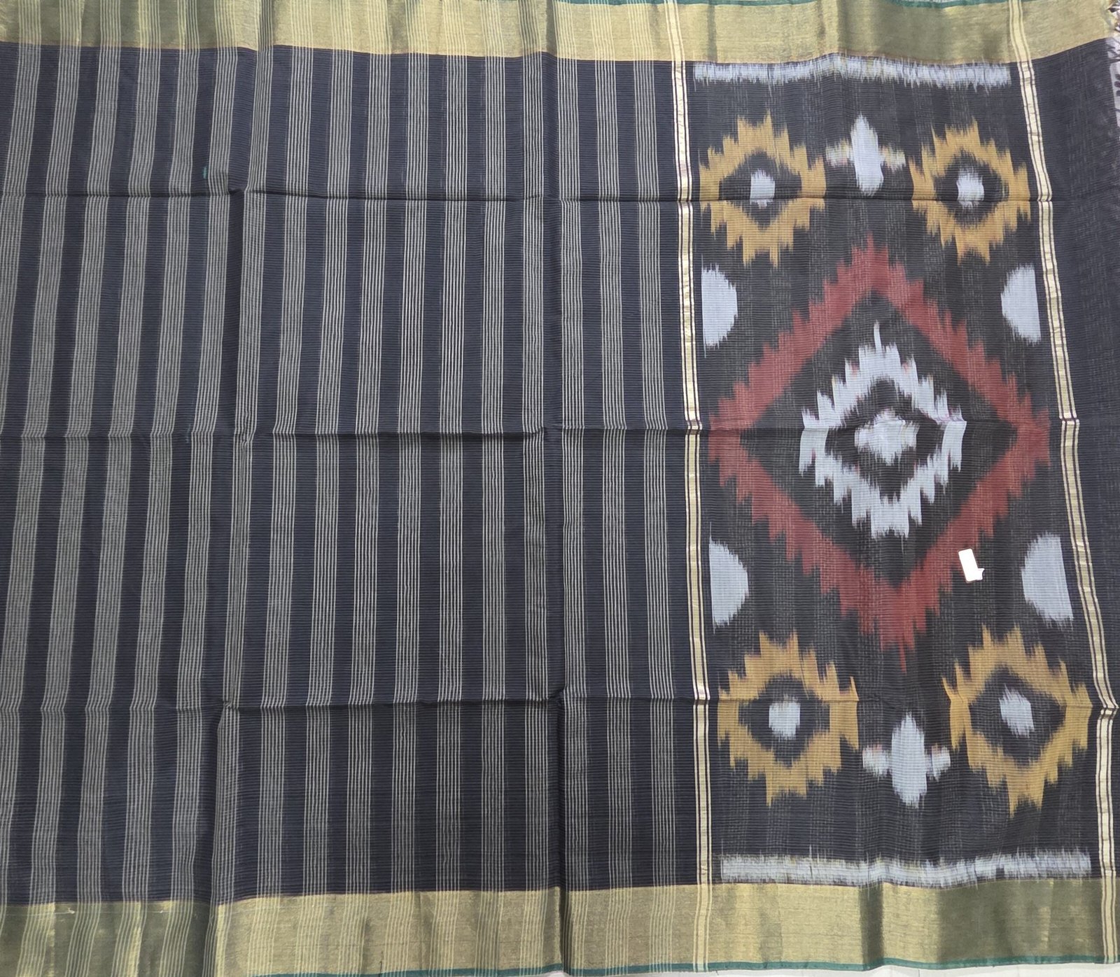 The saree is paired with a striking ikat-inspired pallu, where earthy tones of charcoal, mustard, rust, and ivory form a bold geometric composition. The handcrafted character of the pallu adds depth and contrast, beautifully complementing the understated body.