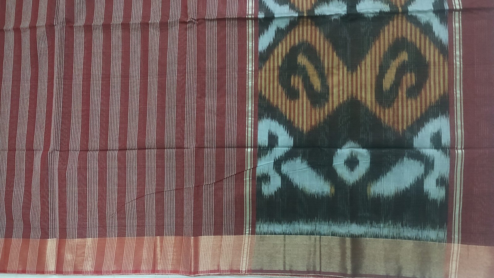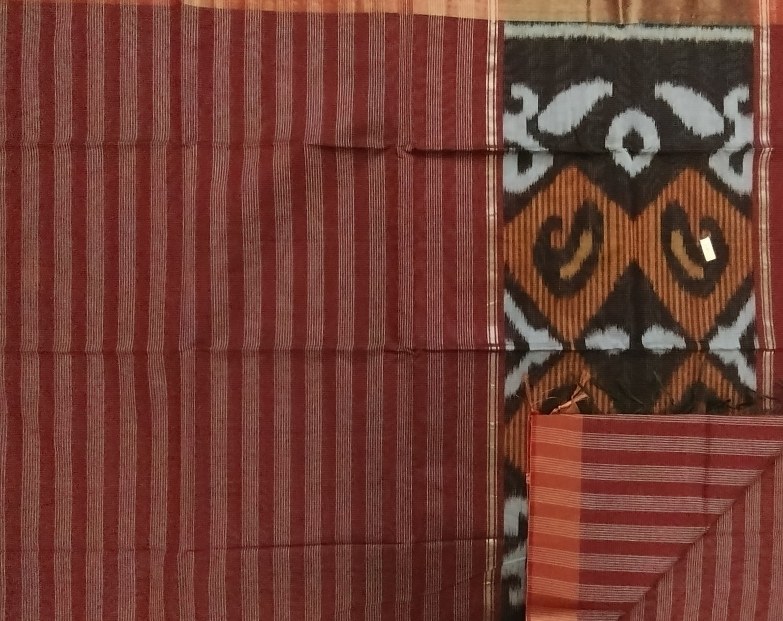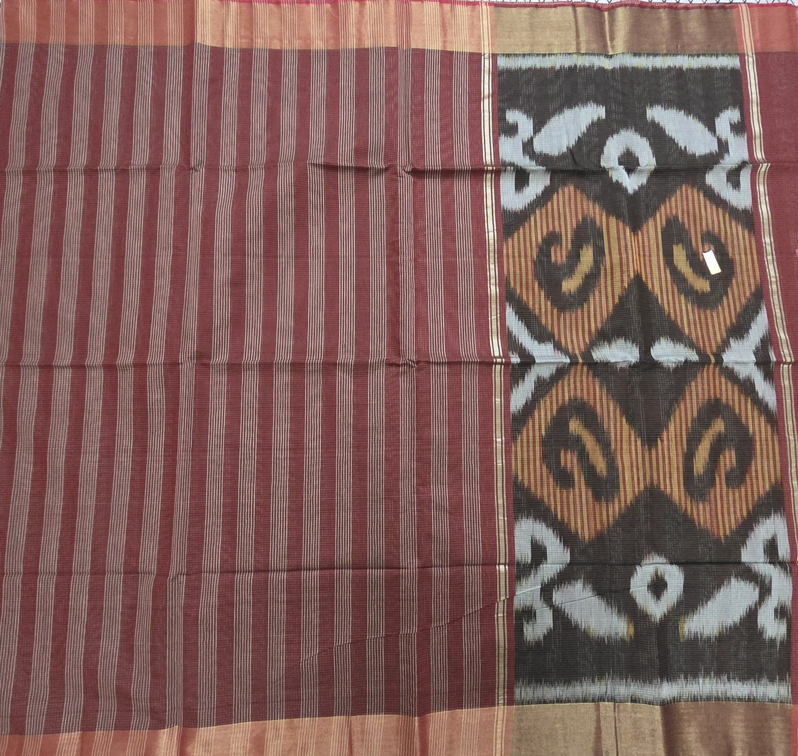 Brick Red Cotton Saree with White Pinstripes and Ikat Pallu