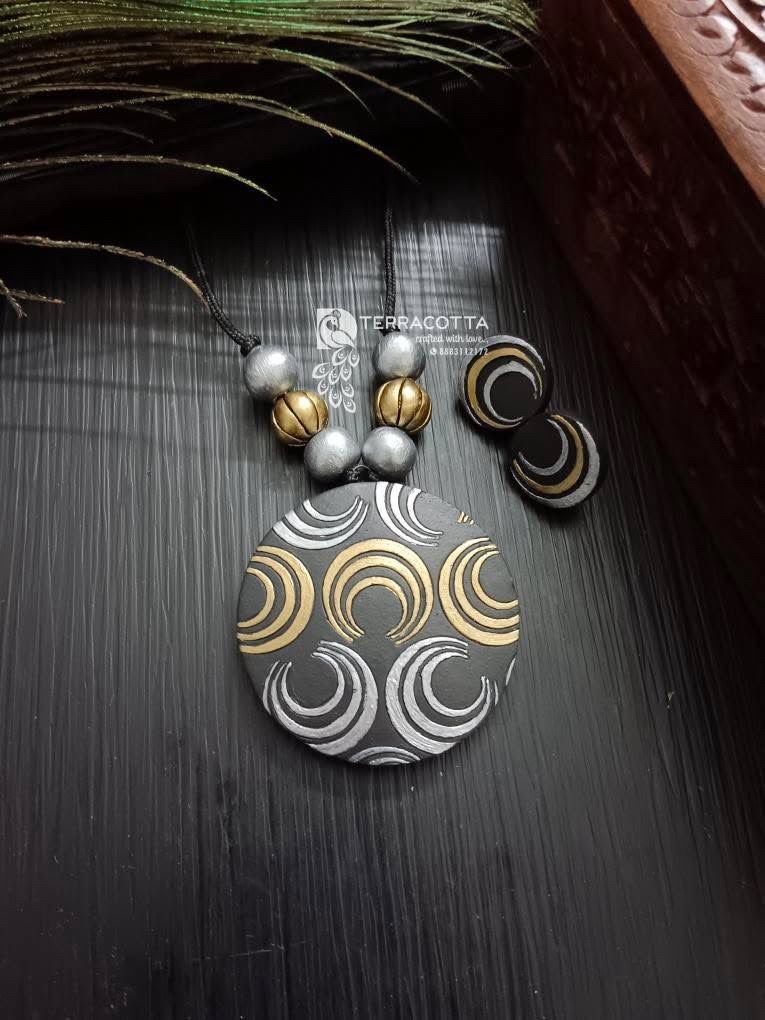 This handcrafted terracotta jewellery set features a bold circular pendant adorned with rhythmic crescent motifs in muted black, silver, and antique gold tones. Inspired by contemporary folk geometry, the necklace and matching studs offer a refined statement — perfect for everyday elegance and modern ethnic styling.