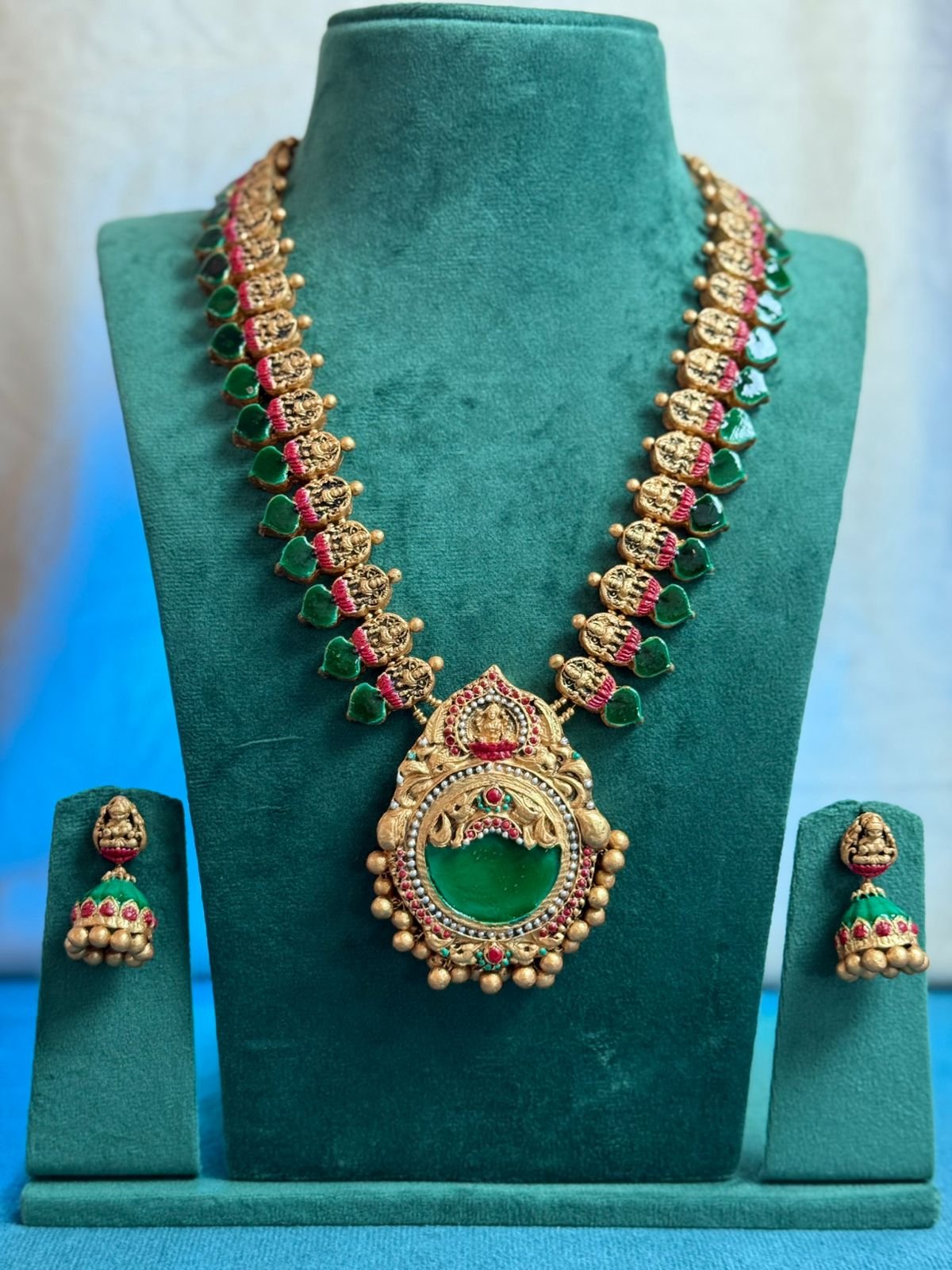 This handcrafted terracotta jewellery set features an ornate circular pendant highlighted with rich green accents, inspired by the traditional Kerala Palakkai maalai and finished in antique gold tones. Rooted in classic temple craftsmanship, the necklace and matching jhumkas reflect timeless heritage charm — perfect for festive occasions and elegant silk ensembles.