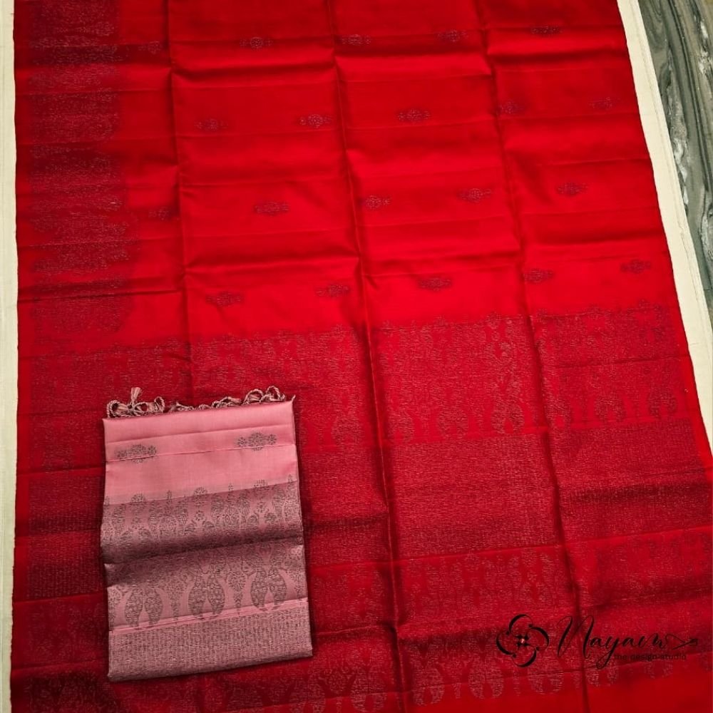 This Sirumugai soft silk saree is rendered in a rich crimson red, a colour synonymous with celebration and timeless elegance. The body features finely woven, understated motifs in black silk thread that add texture while allowing the colour to take centre stage. A subtly detailed border and pallu introduce depth and traditional character without overpowering the saree’s simplicity. Handwoven in pure silk and Silk Mark certified, the fabric has a soft drape and a natural, understated sheen. The saree comes with a coordinated blouse bit and measures 5.5 metres in length with an additional 80 cm blouse piece.