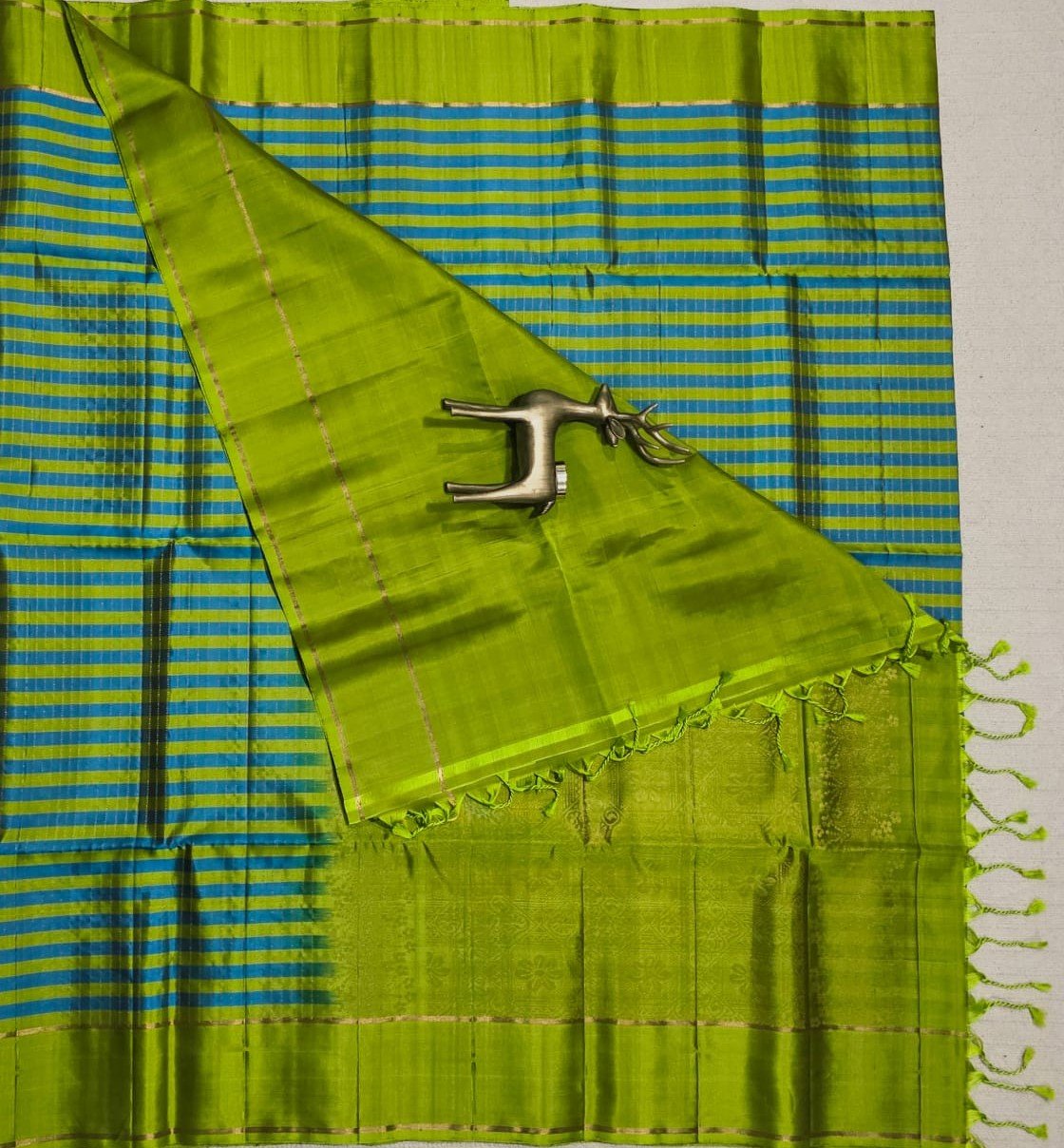 This vibrant Sirumugai soft silk saree features a refreshing parrot green body paired with fine sky blue horizontal stripes that bring rhythm and visual lightness to the weave. The contrasting parrot green pallu adds depth with its soft sheen and subtle woven detailing, creating a lively yet balanced composition. The interplay of bright green and cool blue gives the saree a youthful elegance while retaining traditional charm.