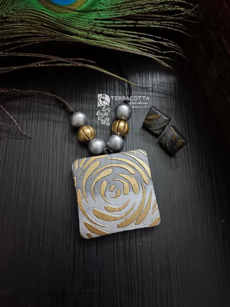 This handcrafted terracotta jewellery set features a bold square pendant adorned with flowing swirl motifs in muted grey and antique gold tones, complemented by rustic metallic bead accents.