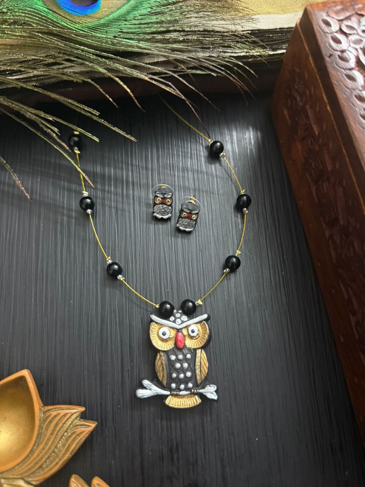 This handcrafted terracotta jewellery set features a charming owl pendant highlighted with hand-painted details in black, gold, and subtle red accents, paired with minimal bead elements.