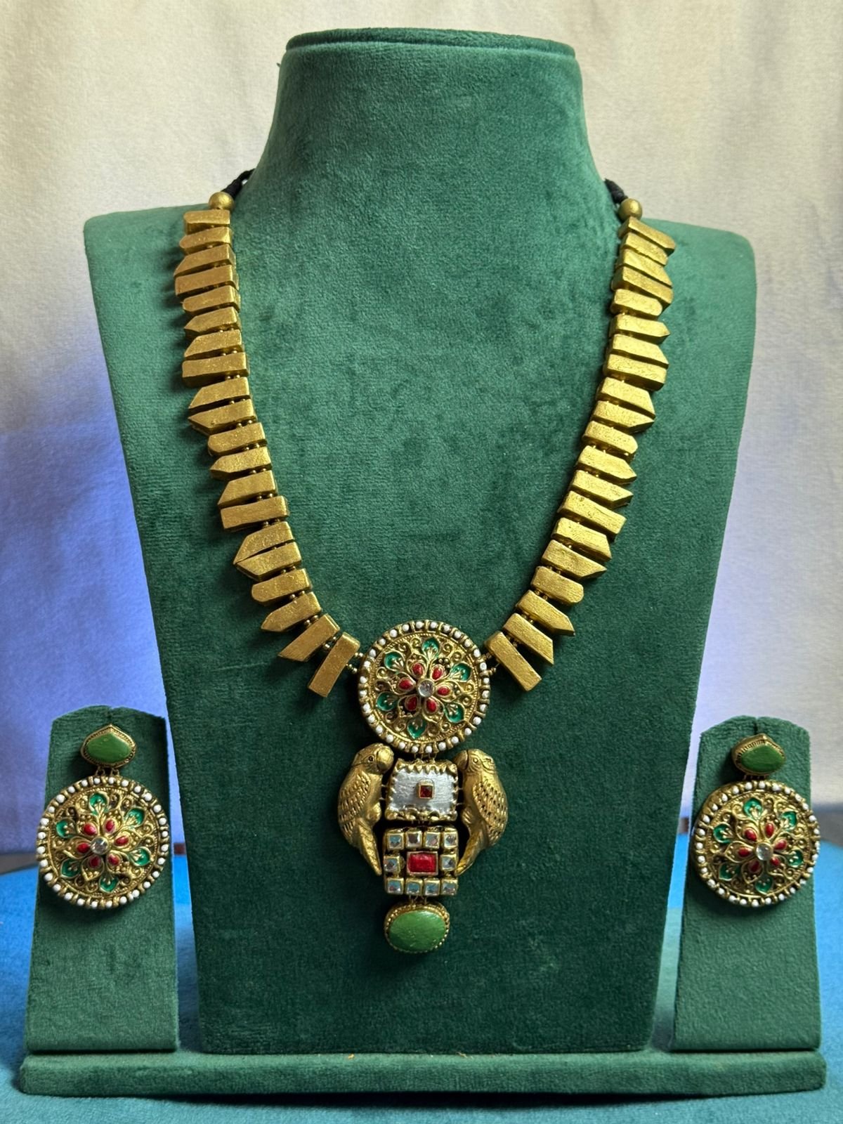 This handcrafted terracotta jewellery set features the classic Mullai Mokkhu–inspired bead design, highlighted with a richly detailed pendant adorned with vibrant green and red accents in antique gold tones.