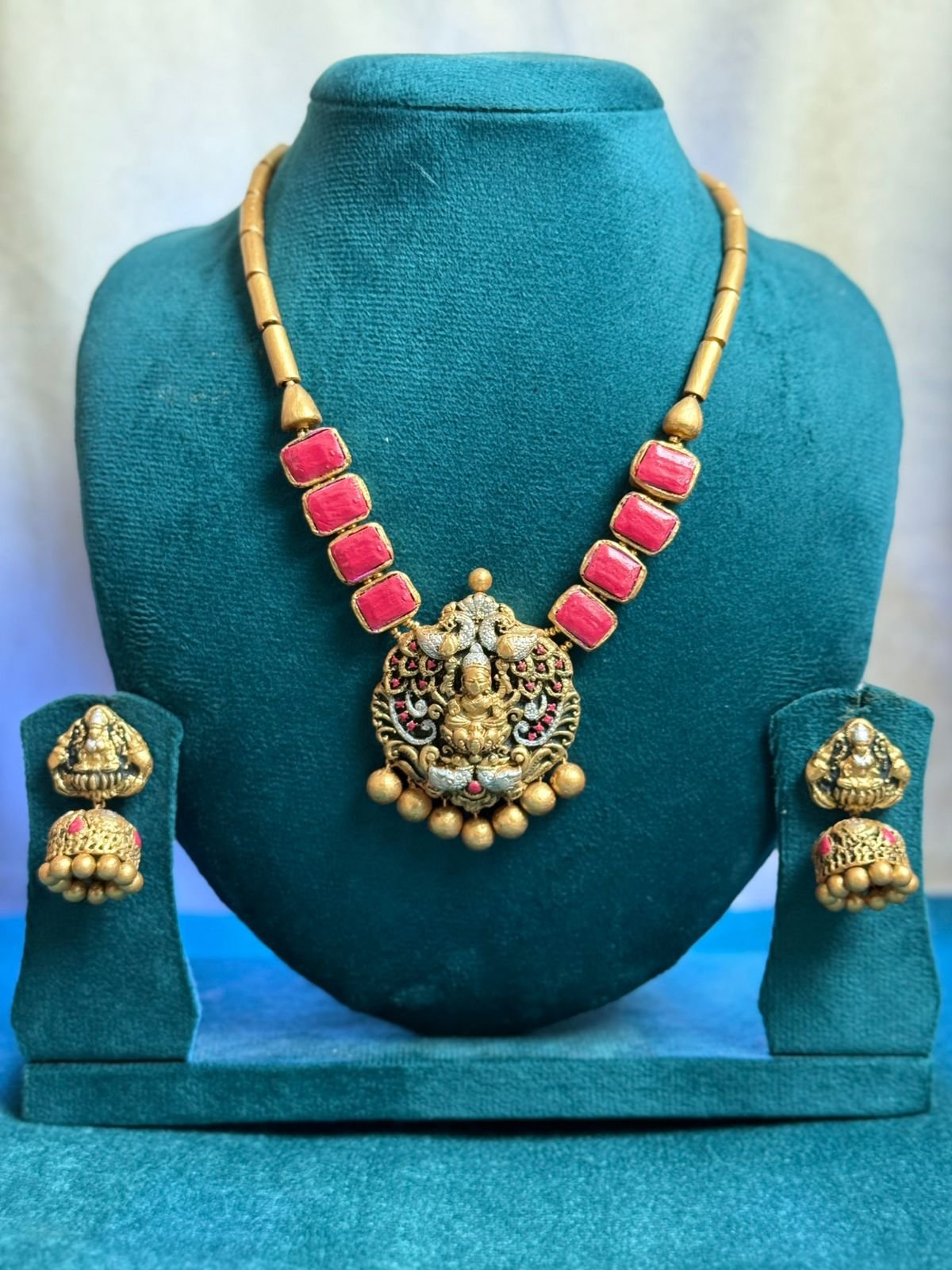 This handcrafted terracotta jewellery set features a richly detailed Lakshmi pendant accented with vibrant pink stone elements and antique gold tones. Inspired by temple artistry, the necklace and matching jhumkas bring together traditional charm and graceful craftsmanship — perfect for festive occasions and heritage weaves.